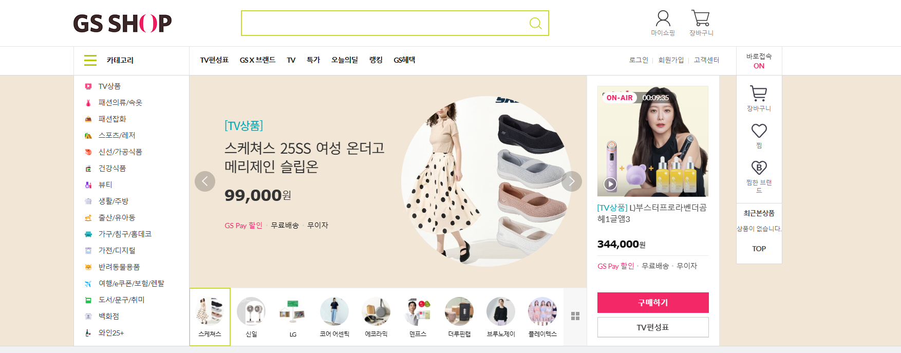 GS홈쇼핑 홈페이지는 방송 중심의 홈쇼핑 플랫폼답게