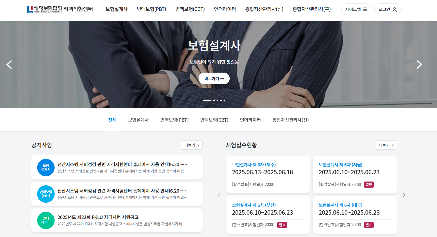 생명보험설계사를 비롯해 언더라이터, 변액보험판매자, 종합자산관리사까지—보험 분야의 주요 자격시험을 통합 운영하는 플랫폼이 바로 이곳입니다.